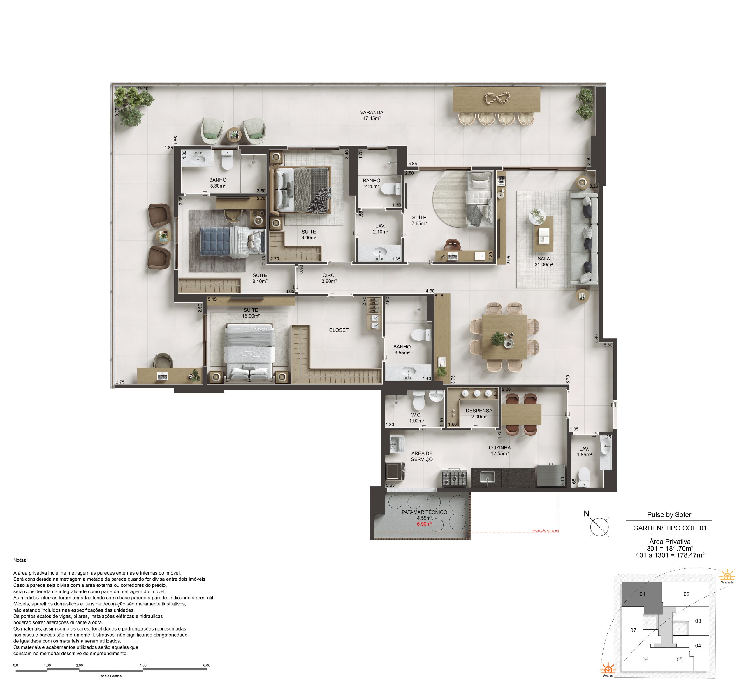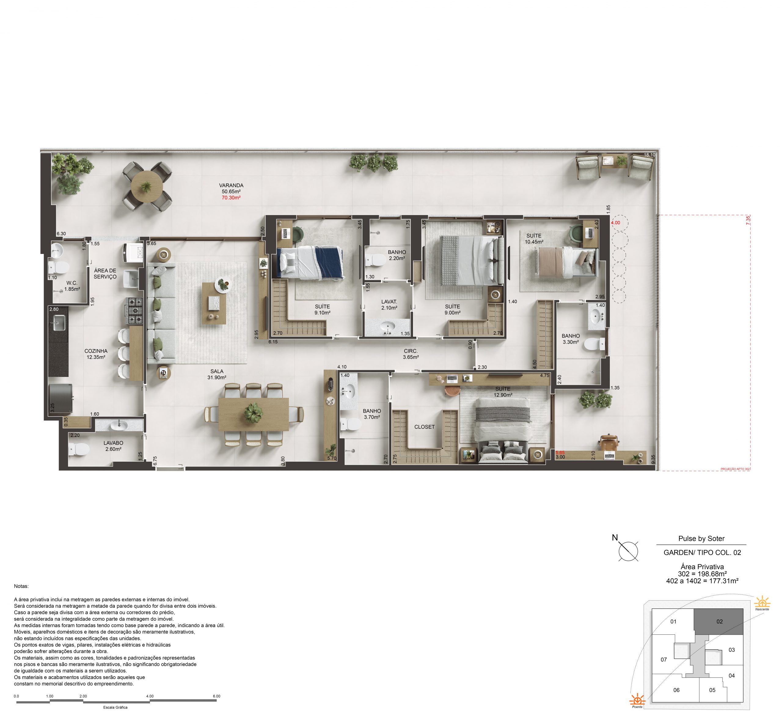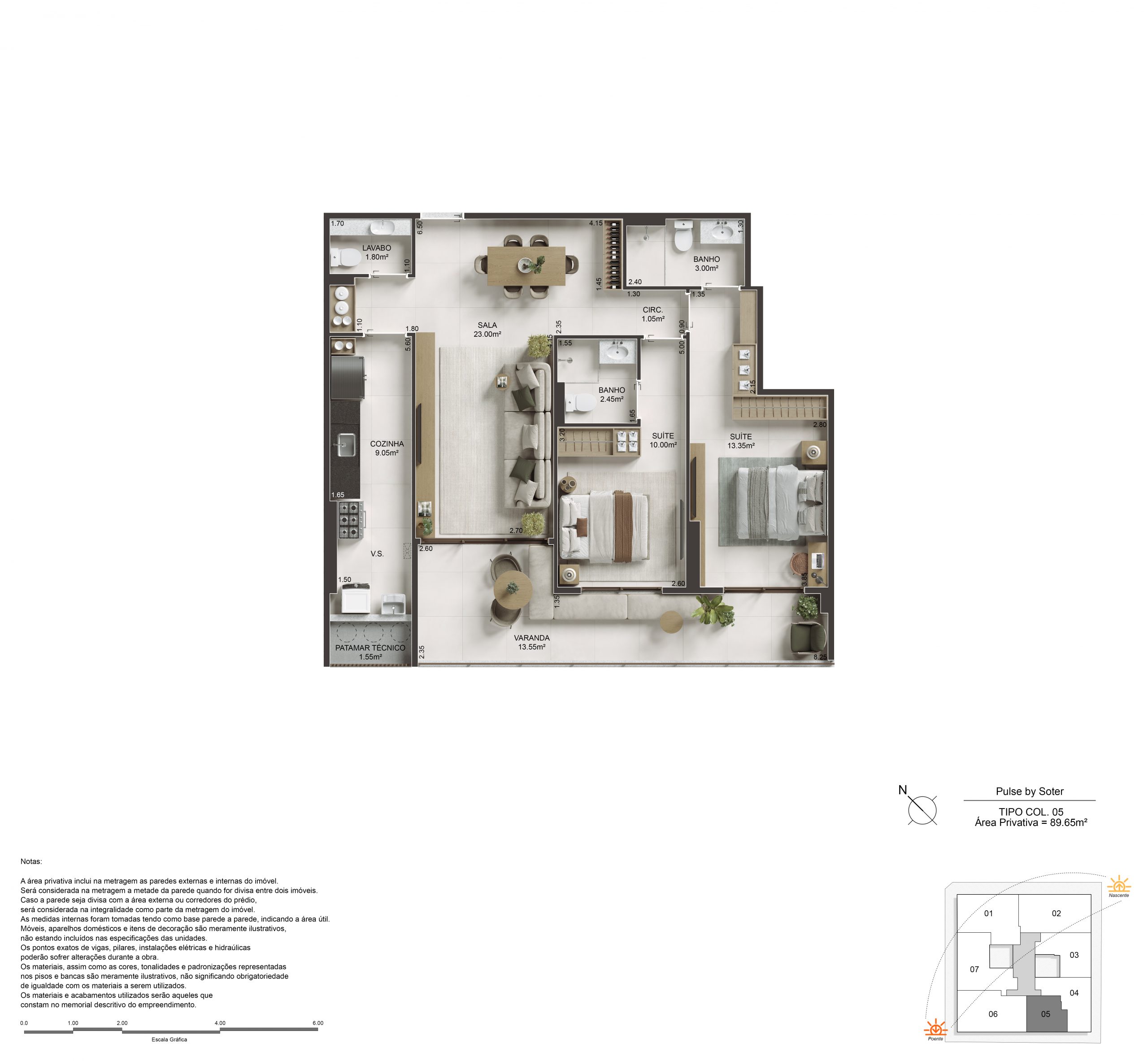 O Pulse oferece 2, 3 e 4 suítes, com metragens que variam de 89,65m² a 180,20m² nas unidades tipo, e coberturas duplex e lineares com até 296,29m². Com suítes master dimensionadas para cama king size e amplas varandas que permeiam a sala e os quartos, cada unidade é entregue com Piso 100% em porcelanato 90x90cm em todo o apartamento e acabamento superior padrão Soter.