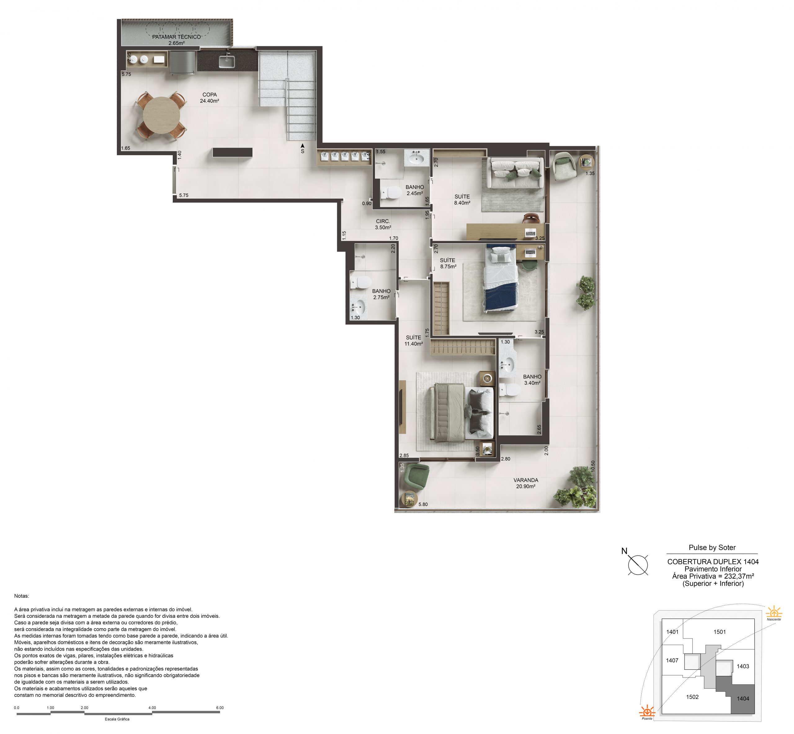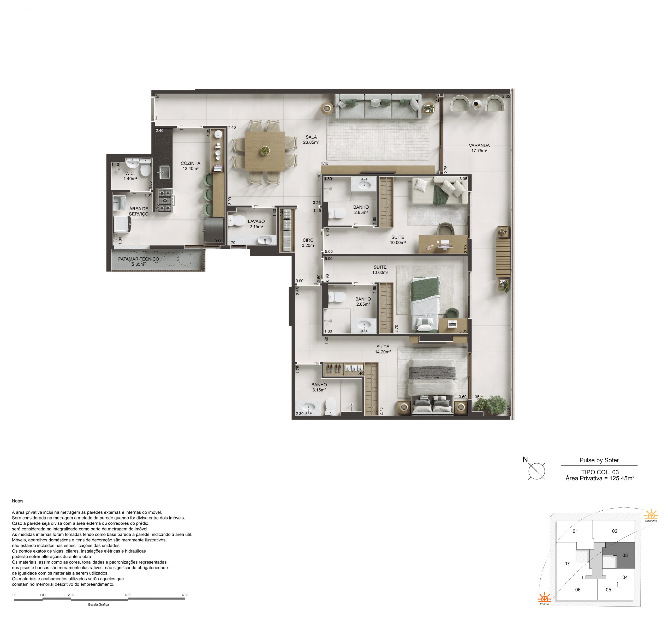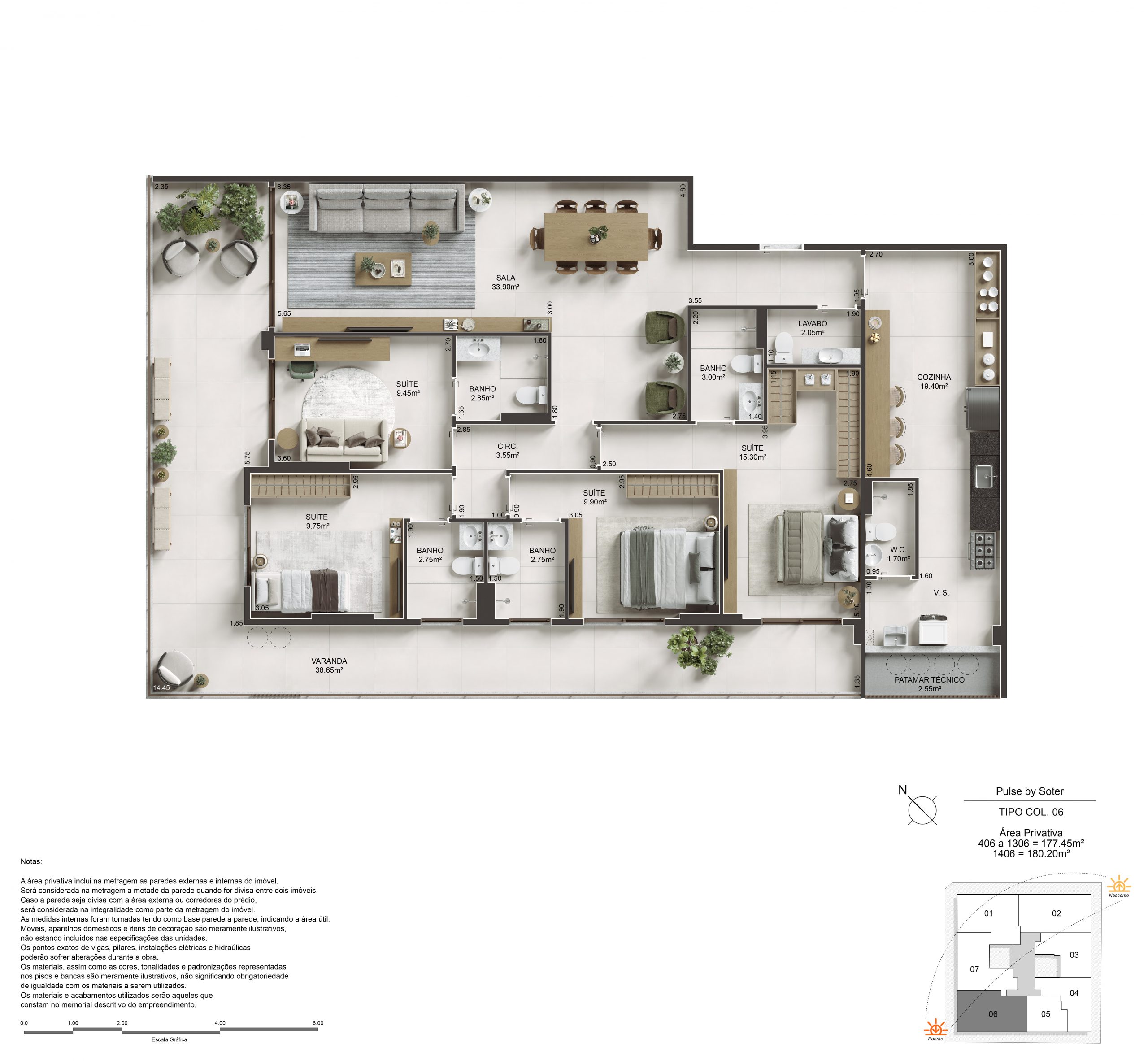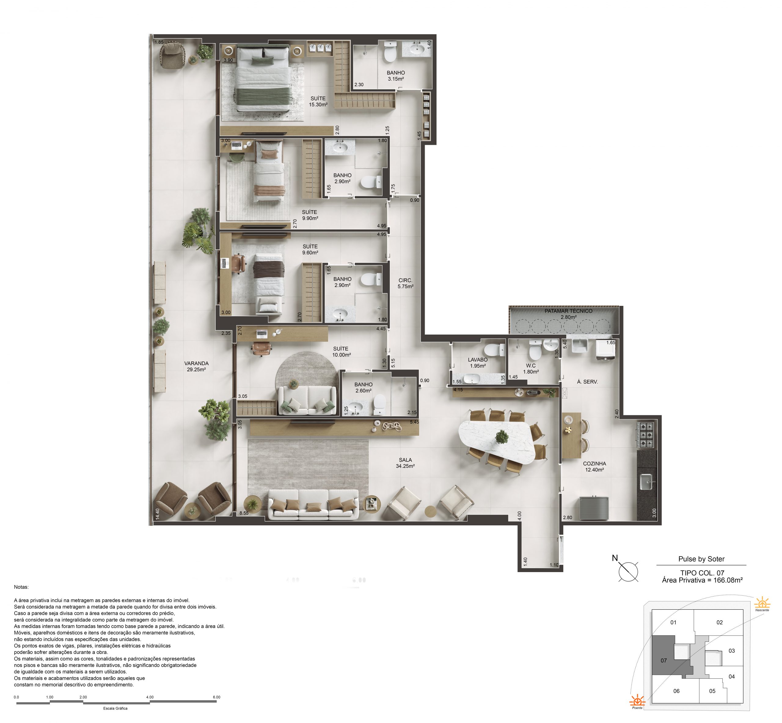 O Pulse oferece 2, 3 e 4 suítes, com metragens que variam de 89,65m² a 180,20m² nas unidades tipo, e coberturas duplex e lineares com até 296,29m². Com suítes master dimensionadas para cama king size e amplas varandas que permeiam a sala e os quartos, cada unidade é entregue com Piso 100% em porcelanato 90x90cm em todo o apartamento e acabamento superior padrão Soter.